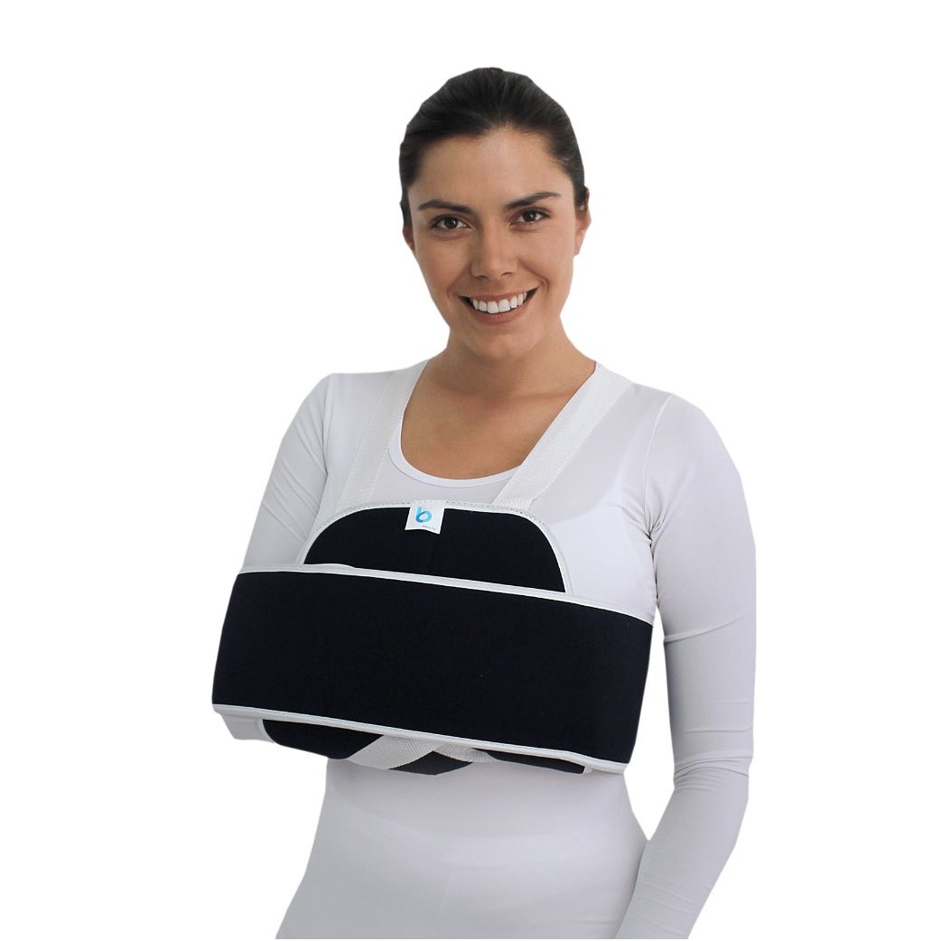 Cangurera con doble tirante para repartir el peso en ambos hombros, banda para inmovilización de brazo y hombro, ambos confeccionados en tela acojinada y cierres de contacto ajustables.